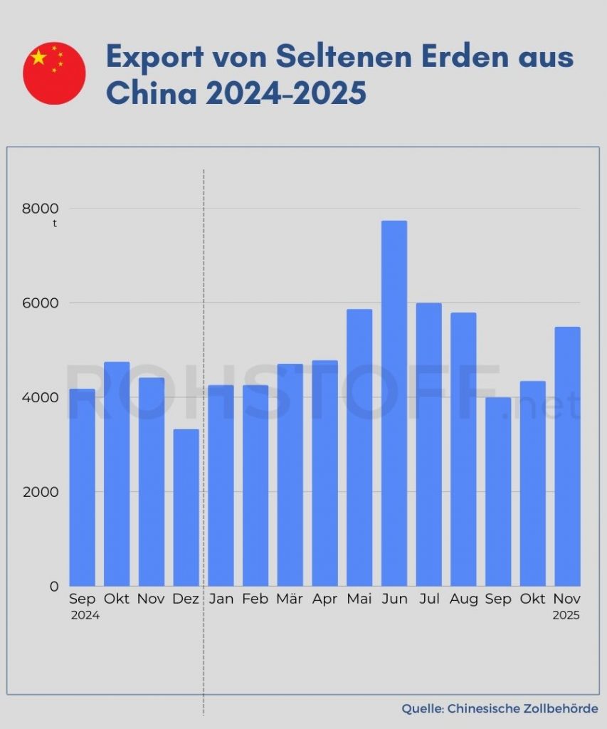 Seit April gelten Exportauflagen für mehrere Elemente der Gruppe der Seltenen Erden, so etwa für Dysprosium und Terbium. Wie sich hier die Ausfuhren im November entwickelt haben, wird sich erst in einigen Wochen sagen lassen, wenn die Behörden den zweiten Datensatz für den vergangenen Monat veröffentlichen.