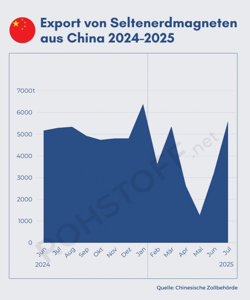 Laut Daten der chinesischen Zollbehörde haben die Exporte von Permanentmagneten aus Seltenen Erden im Juli deutlich zugenommen. Gegenüber dem Vormonat Juni wurden 75 Prozent mehr dieser unter anderem für Windkraftanlagen und E-Motoren eingesetzten Komponenten ausgeführt. Wichtigstes Zielland war Deutschland mit 1.116 Tonnen, was fast einem Fünftel der gesamten Exportmenge entspricht. Auf Platz zwei folgen die USA, danach Südkorea, Vietnam und Indien. Die indische Automobilindustrie hatte zuletzt über die schwierige Versorgungslage geklagt, da nach Inkrafttreten von Exportauflagen für bestimmte Seltene Erden deutlich weniger Material im Markt verfügbar war.