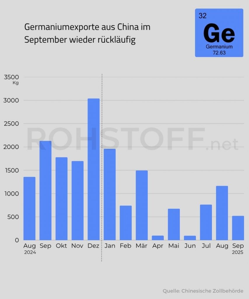 Der Germaniumexport ging im letzten Monat noch stärker zurück, um 55 Prozent auf 523 Kilogramm. Den Großteil der Ausfuhren erhielt Russland mit 362 Kilogramm, 160 gingen nach Deutschland und nur ein Kilogramm nach Frankreich. Auch im August waren Russland und Deutschland die wichtigsten Zielländer für das Metall gewesen.