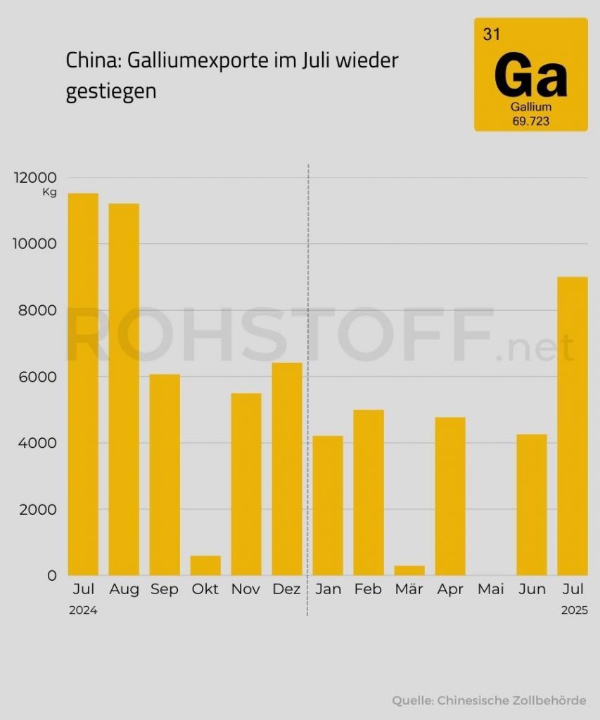 Hauptproduzent China hat seine Galliumexporte im Juli deutlich gesteigert, wie die neuesten Zolldaten zeigen. Insgesamt verließen 9.007 Kilogramm des kritischen Metalls das Land, mehr als doppelt so viel wie im Juni, wo es 4.260 Kilogramm waren.