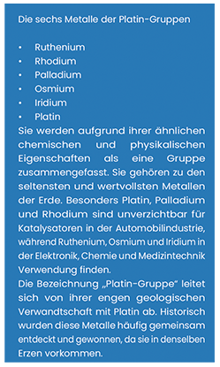 Die Platin-Gruppen-Metalle (PGM) – bestehend aus Ruthenium, Rhodium, Palladium, Osmium, Iridium und Platin – treten in der Natur fast ausschließlich gemeinsam in komplexen Erzen auf. Der Abbau und die Trennung sind technisch anspruchsvoll und erfordern hochspezialisierte Verfahren. Aufgrund ihrer einzigartigen physikalischen und chemischen Eigenschaften zählen die PGM zu den strategisch bedeutendsten Rohstoffen weltweit. Besonders hervorzuheben sind ihre extreme Korrosionsbeständigkeit, ihre hohe Temperaturstabilität und ihre katalytischen Eigenschaften.
